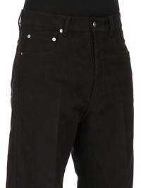 RICK OWENS FW25 CONCORDIANS GETH JEANS IN BLACK BRUSHED HEAVY TWILL THESE GETH JEANS ARE A FULL LENGTH 5 POCKET JEAN WITH A LOW-RISE AND WIDE FIT. THEY HAVE A SILVER BUTTON FLY, BELT LOOPS AND POCKET RIVETS THIS MEDIUMWEIGHT COTTON TWILL FABRIC HAS A SOFT BRUSHED HANDFEEL THIS FABRIC IS MADE USING GOTS CERTIFIED ORGANIC COTTON WHICH MEANS THE NATURAL FIBER IS GROWN WITHOUT HARMFUL CHEMICALS, LEAVING OUR SOIL, AIR AND WATER CLEANER FROM CONTAMINATES COLOR: BLACK MATERIAL: 100% COTTON MODEL IS 189CM TALL MODEL WEARS SIZE 31