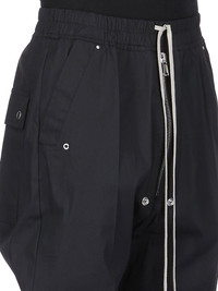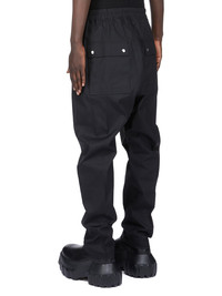 RICK OWENS SS25 HOLLYWOOD BELA PANTS IN BLACK HEAVY COTTON POPLIN THESE BELA PANTS ARE FULL LENGTH WITH A LOOSE FIT AND A DROPPED CROTCH. THEY HAVE AN ELASTICIZED WAISTBAND WITH DRAWSTRING, A BELA FLY WITH EXPOSED CENTER ZIPPER AND SNAP DETAIL AT BOTTOM, SIDE WELT POCKETS WITH EYELET AND RIVET DETAIL AND BACK POCKETS WITH FLAPS AND SNAPS THIS MEDIUMWEIGHT COTTON POPLIN HAS A CRISP HANDFEEL AND WASHED FINISH THIS FABRIC IS MADE USING GOTS CERTIFIED ORGANIC COTTON WHICH MEANS THE NATURAL FIBER IS GROWN WITHOUT HARMFUL CHEMICALS, LEAVING OUR SOIL, AIR AND WATER CLEANER FROM CONTAMINATES COLOR: BLACK MATERIAL: 97% COTTON + 3% ELASTANE MODEL IS 189CM TALL MODEL WEARS SIZE 48
