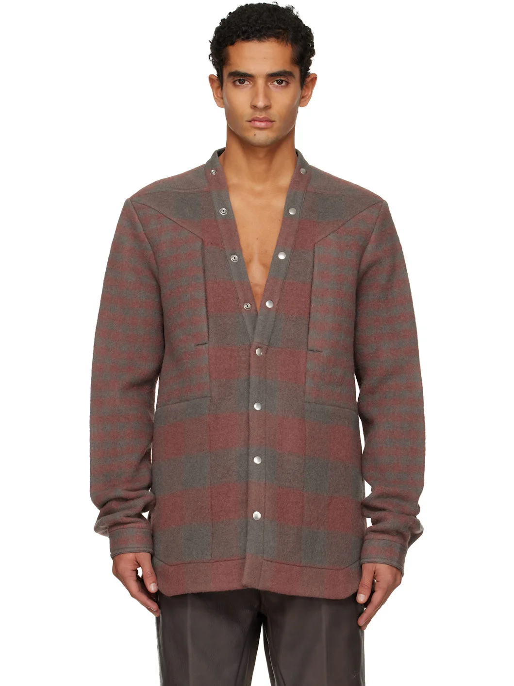 RWS-certified virgin wool melton overshirt. · Check pattern throughout · V-neck · Press-stud closure extends to collar · Welt pockets at chest · Shirttail hem · Press-stud barrel cuffs · Zip pockets at interior · Partial cupro satin lining Supplier color: Rosewood plaid Body: 100% virgin wool. Trim 1: 97% cotton, 3% elastane. Trim 2: 100% cupro. Trim 3: 100% cotton. Made in Italy 252232M192032
