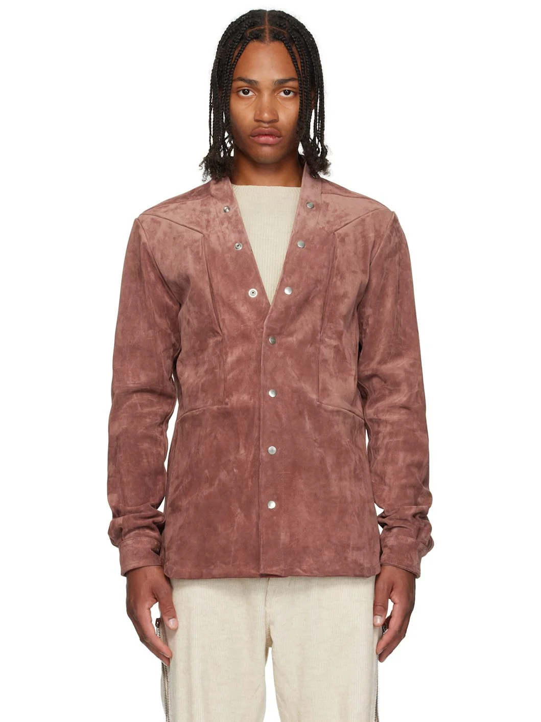 Waxed calfskin suede jacket. · Press-stud closure at collar · Welt pockets at chest · Shirttail hem · Pleats at press-stud cuffs · Plain-woven cotton and cupro linings Supplier color: Rosewood Body: 100% calfskin. Lining: 100% cupro. Pocket lining: 100% cotton. Made in Moldova 252232M192007