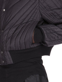 RICK OWENS FW25 CONCORDIANS QUILTED FLIGHT JKT IN BLACK LIGHT NYLON THIS QUILTED FLIGHT IS WAIST LENGTH WITH LONG SLEEVES. IT HAS A CENTRE FRONT OPENING WITH FIVE SNAPS AND RIBBED FLIGHT NECK, WAISTBAND WRISTS. IT IS A LIGHTWEIGHT QUILTED NYLON WITH AN ALL OVER STITCHING DESIGN. IT HAS TWO INTERNAL ZIPPERED POCKETS THIS AIRY AND LIGHTWEIGHT NYLON IS MADE USING GRS CERTIFIED RECYCLED NYLON WHICH ENSURES A REDUCTION IN WATER CONSUMPTION, EMISSIONS AND HAZARDOUS WASTE, LESSENING THE DEPENDENCE ON NON-RENEWABLE RESOURCES COLOR: BLACK. MATERIAL: 100% POLYAMIDE MODEL IS 189CM TALL MODEL WEARS SIZE 48