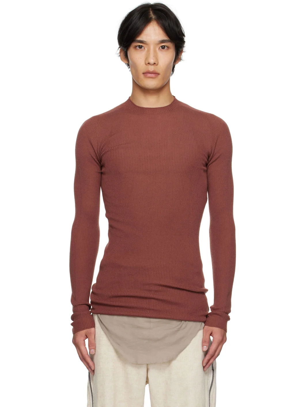 Lightweight rib-knit virgin wool sweater. · Semi-sheer · Rib-knit crewneck · Saddle shoulders · Central garter stitch stripe at back Supplier color: Dark pink 100% virgin wool. Made in Italy 252232M201011