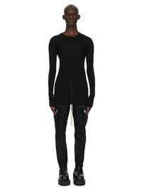 RICK OWENS FW24 PORTERVILLE RIB LS T IN BLACK VISCOSE SILK RIB JERSEY THIS RIB LS T IS BELOW HIP-LENGTH WITH A SLIM FIT AND LONG SLEEVES. IT HAS A RIBBED ROUND NECK, RAW CUT HEM AND CUFFS, AND FEATURES THE SIGNATURE SINGLE SEAM RUNNING DOWN CENTRE BACK SPINE THIS LIGHTWEIGHT VISCOSE AND SILK RIB JERSEY HAS A DISTINCT RIB PATTERN AND SOFT HANDFEEL.THIS JERSEY IS MADE FROM FSC® CERTIFIED VISCOSE WHICH ENSURES THAT THE FIBERS ARE PRODUCED FROM RESPONSIBLY MANAGED SOURCES AND NO DEFORESTATION OCCURS WE STRIVE TO KEEP OUR PRODUCTION AS LOCAL AS POSSIBLE. THE FULL MANUFACTURING CYCLE OF THIS PRODUCT, FROM THE MATERIAL KNITTING TO SEWING AND FINISHING, WAS UNDERTAKEN CLOSE TO OUR HOME BASE IN CONCORDIA, ITALY. - COLOR: BLACK - MATERIAL: 88% VISCOSE + 12% SILK - MODEL IS 189CM TALL - MODEL WEARS SIZE S