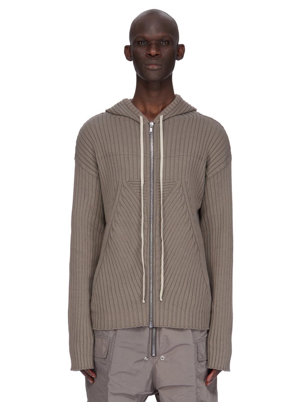 RICK OWENS SS25 HOLLYWOOD ZIPPED HOODIE IN DINGE MEGARIB COTTON KNIT THIS ZIPPED HOODIE IS HIP LENGTH AND HAS LONG SLEEVES. IT HAS A CENTER FRONT ZIPPER, A DRAWSTRING HOOD AND TWO FRONT POCKETS. IT FEATURES A MEGARIB KNIT DESIGN, WITH A WIDE VERTICAL RIB ON BACK AND FRONT BODY, AND DIAGONAL LINES RUNNING DOWNWARDS INTO THE CENTER FRONT. IT HAS A VERTICAL RIB BACK WITH THE SIGNATURE KNIT CHANNEL RUNNING DOWN THE CENTER BACK SPINE THIS HEAVYWEIGHT COTTON IS KNITTED IN A WIDE RIB WITH A GRAPHIC MOTIF. IT HAS A SOFT HANDFEEL COLOR: DINGE MATERIAL: 100% COTTON MODEL IS 189CM TALL MODEL WEARS SIZE M
