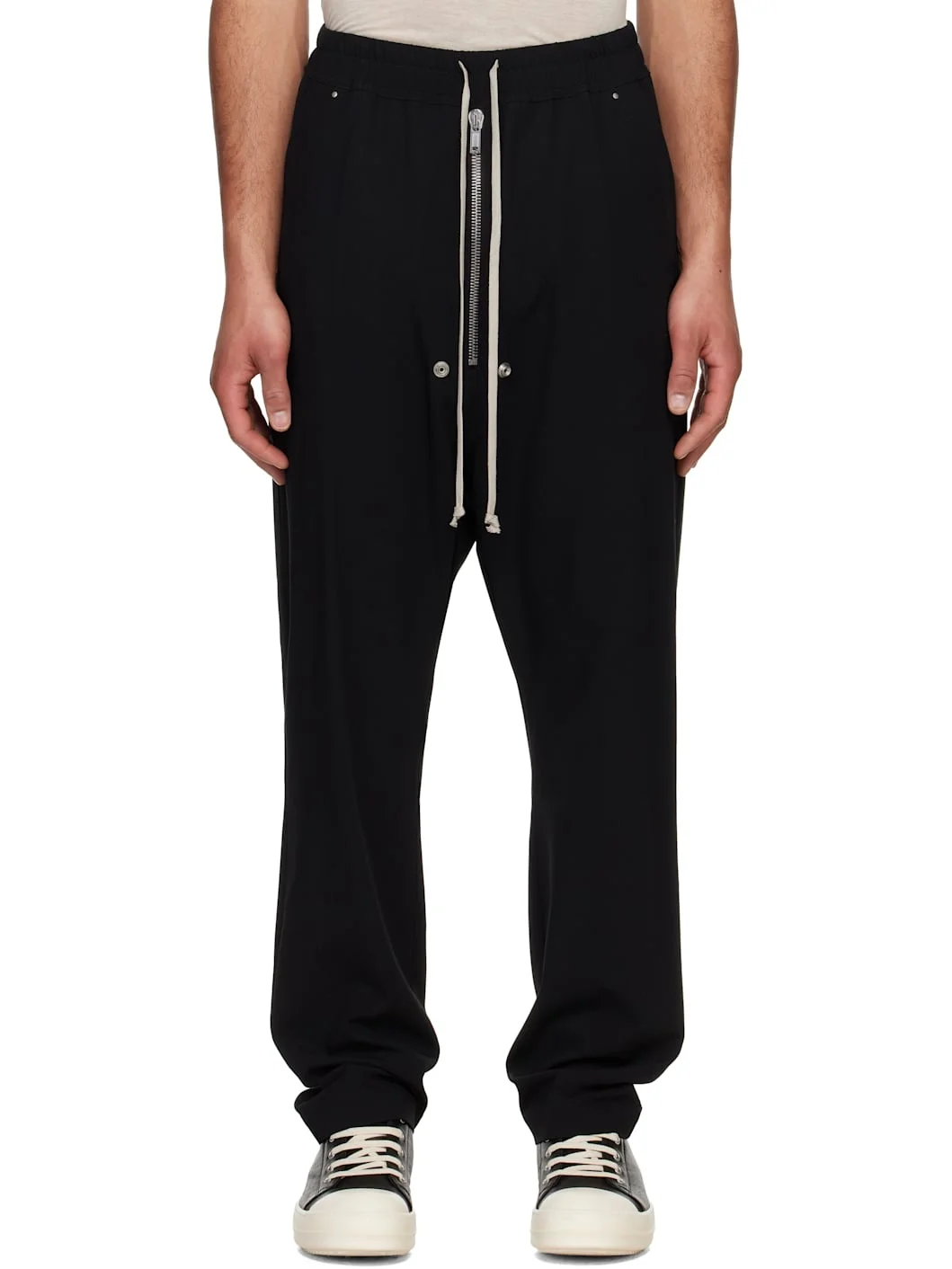Wool grain de poudre trousers. · Drawstring at elasticized waistband · Four-pocket styling · Exposed zip fly · Creased legs · Rivets, grommets, and press-stud hardware at front Supplier color: Black 100% wool. Made in Moldova 251232M191014