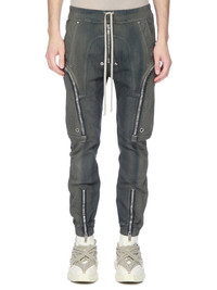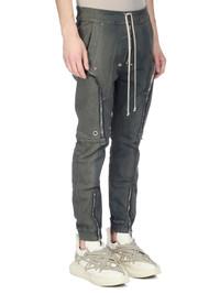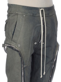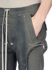 RICK OWENS FW25 CONCORDIANS BAUHAUS CARGO IN IN DARKDUST DEGRADE SLUB STRETCH DENIM THIS LIGHTWEIGHT DRKDUST DEGRADE DENIM IS MADE ON A 10OZ JAPANESE INDIGO AND NATURAL SLUB DENIM. THE READY GARMENT IS STONE WASHED WITH MINERAL DYES AND THEN SPRAYED BY HAND TO ACHIEVE THE DEGRADE COLORATION THIS FABRIC IS MADE USING GOTS CERTIFIED ORGANIC COTTON WHICH MEANS THE NATURAL FIBER IS GROWN WITHOUT HARMFUL CHEMICALS, LEAVING OUR SOIL, AIR AND WATER CLEANER FROM CONTAMINATES THIS GARMENT IS TREATED IN AN ITALIAN WASH HOUSE BASED IN THE VENETO AREA OF ITALY, THAT PRODUCES IN SMALLER TREATMENT BATHS TO REDUCE WATER WASTE AND UTILIZE A WATER PURIFYING PROCESS THAT ENABLES THEM TO RECYCLE A PORTION OF THE WATER USED. ALL OF OUR DENIM WASHES ARE ZDHC CERTIFIED COLOR: DARKDUST DEGRADE MATERIAL: 91% COTTON + 6% ELASTOMULTIESTER + 3% RUBBER FIBER INNER BUSTIER 84% NYLON + 16% ELASTANE MODEL IS 189CM TALL MODEL WEARS SIZE 48