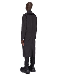 RICK OWENS SS25 HOLLYWOOD BRAD COAT IN BLACK TECH FAILLE THIS BRAD COAT IS MID-CALF LENGTH WITH A LOOSE, STRAIGHT FIT AND LONG SLEEVES. IT HAS A CENTER FRONT ZIPPER OPENING, RUNNING FROM THROAT TO HIP LEVEL, AND A CLASSIC COLLAR IT ALSO HAS DIAGONAL SIDE FRONT WELT POCKETS WITH AN INTERNAL SNAP, SNAP CUFFS AND DOUBLE TOPSTITCHING. IT FEATURES SIGNATURE LEVEL SHOULDER SEAMS AND A COTTON WEBBING STRAP WITH RIVET DETAIL ON THE BACK YOKEIT IS FULLY LINED AND HAS INTERNAL ZIPPERED POCKETS THIS LIGHTWEIGHT AND TECHNICAL TAFFETA HAS SMALL FAILLE STRUCTURE AND A CRISPY HANDFEEL. THIS FABRIC IS MADE USING GRS CERTIFIED RECYCLED POLYESTER WHICH ENSURES A REDUCTION IN WATER CONSUMPTION, EMISSIONS AND HAZARDOUS WASTE, LESSENING THE DEPENDENCE ON NON-RENEWABLE RESOURCES COLOR: BLACK MATERIAL: 100% POLYESTER FRONT AND POCKETS LINING 100% COTTON BACK AND SLEEVES LINING 100% CUPRO MODEL IS 189CM TALL MODEL WEARS SIZE 46