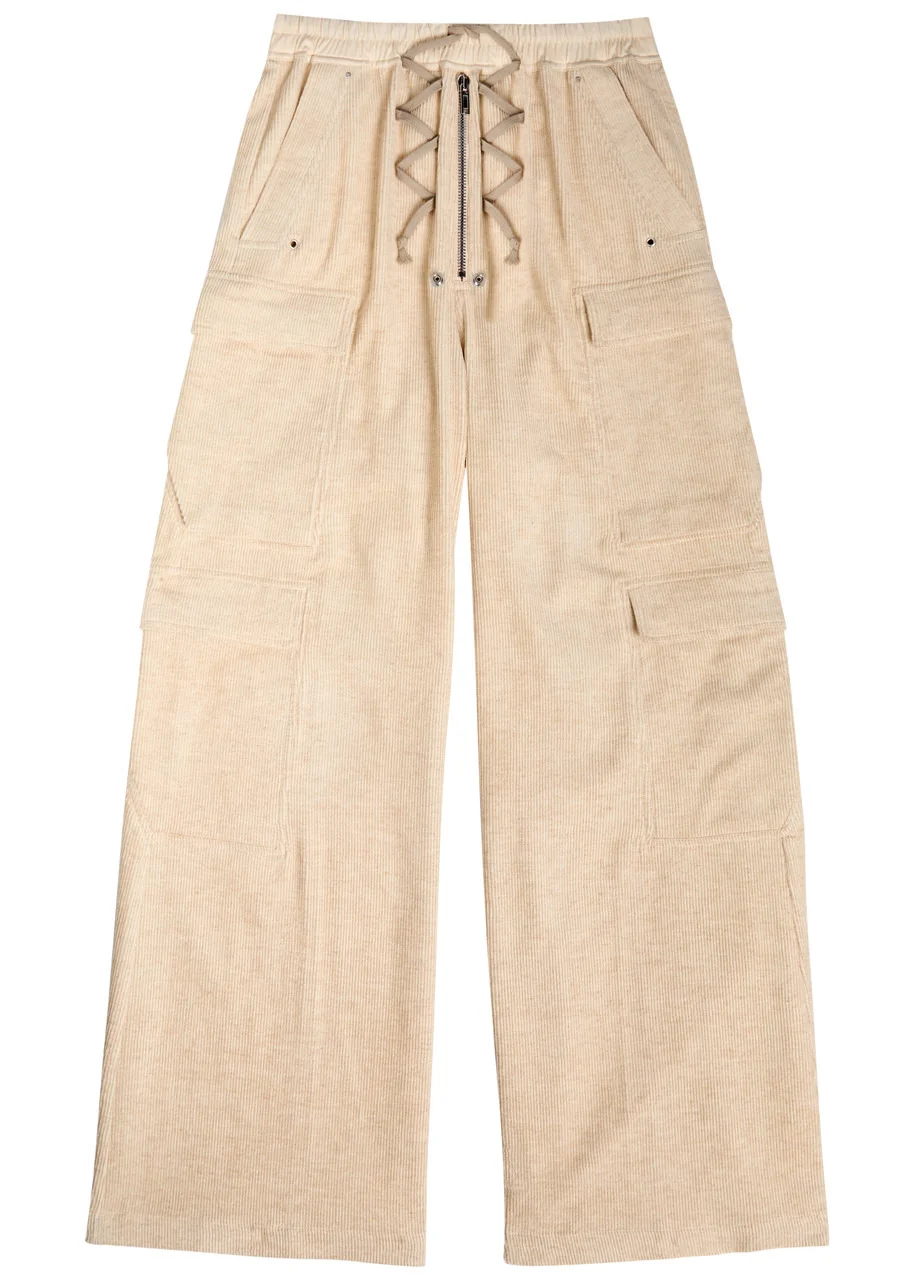 Info & Care Rick Owens;corduroy cargo trousers Elasticated drawstring waistband, zip-fastening fly, side slip pockets, four press-stud fastening front flap pockets, stud and eyelet embellishments, two press-stud fastening back slit pockets Pull on 74% cotton,;26% linen Hand wash Size & Fit Inside leg length: 32 inches/ 81cm Midweight Wide flared-leg cut Model is 6'1"/ 186cm;and wears a size IT48