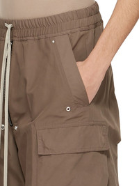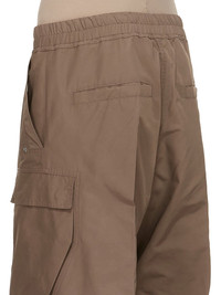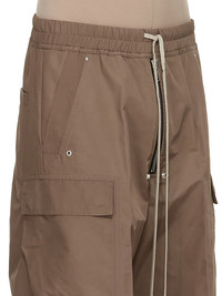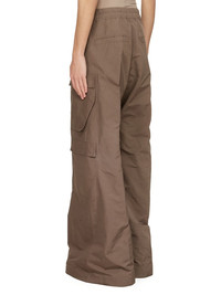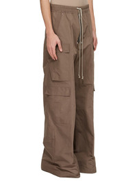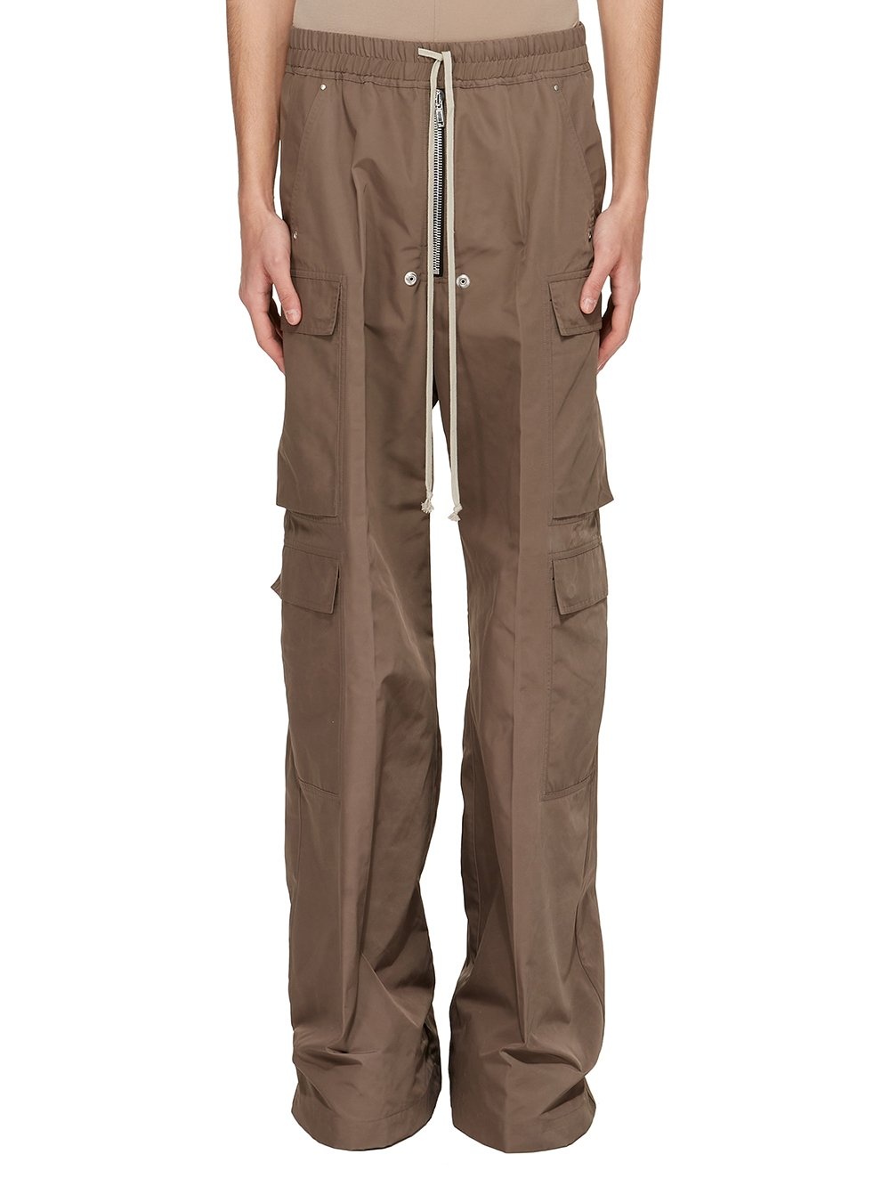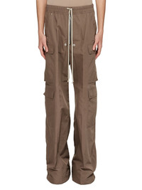RICK OWENS SS25 HOLLYWOOD CARGOBELAS IN DUST TECH FAILLE THESE CARGOBELAS PANTS ARE FULL-LENGTH WITH A LOW CROTCH AND WIDE LEG. THEY FEATURE AN ELASTICIZED WAISTBAND WITH DRAWSTRING AND A BELA EXPOSED CENTER ZIPPER WITH TWO SNAP DETAIL AT BOTTOM. THEY HAVE SIDE WELT POCKETS WITH RIVET AND EYELET DETAIL, FOUR BEVELED CARGO POCKETS ON THE SIDE LEG AND TWO REAR WELT POCKETS WITH CONCEALED SNAPS AND TOPSTITCHING THIS LIGHTWEIGHT AND TECHNICAL TAFFETA HAS SMALL FAILLE STRUCTURE AND A CRISPY HANDFEEL. THIS FABRIC IS MADE USING GRS CERTIFIED RECYCLED POLYESTER WHICH ENSURES A REDUCTION IN WATER CONSUMPTION, EMISSIONS AND HAZARDOUS WASTE, LESSENING THE DEPENDENCE ON NON-RENEWABLE RESOURCES COLOR: DUST MATERIAL: 100% POLYESTER MODEL IS 189CM TALL MODEL WEARS SIZE 48
