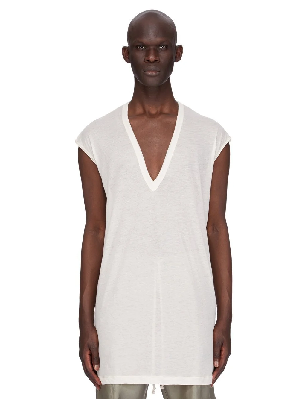 RICK OWENS SS25 HOLLYWOOD DEEP V SL T IN NATURAL UNSTABLE COTTON THIS DEEP V SL T IS BELOW-HIP LENGTH, IT HAS A DEEP V NECK AND WIDE SHOULDERS WITH REINFORCED, RAW CUT, ARMHOLES. IT FEATURES THE SIGNATURE SINGLE SEAM RUNNING DOWN THE CENTER BACK SPINE THIS LIGHTWEIGHT COTTON JERSEY IS SEMI-TRANSPARENT WITH A SOFT HANDFEEL. THIS JERSEY IS MADE USING GOTS CERTIFIED ORGANIC COTTON WHICH MEANS THE NATURAL FIBER IS GROWN WITHOUT HARMFUL CHEMICALS, LEAVING OUR SOIL, AIR AND WATER CLEANER FROM CONTAMINATES WE STRIVE TO KEEP OUR PRODUCTION AS LOCAL AS POSSIBLE. THE FULL MANUFACTURING CYCLE OF THIS PRODUCT, FROM THE MATERIAL KNITTING TO SEWING AND FINISHING, WAS UNDERTAKEN CLOSE TO OUR HOME BASE IN CONCORDIA, ITALY COLOR: NATURAL MATERIAL: 100% COTTON MODEL IS 189CM TALL MODEL WEARS SIZE XXL