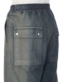 RICK OWENS FW25 CONCORDIANS WIDE BELA PANTS IN 14OZ DARKDUST DEGRADE SLUB DENIM THESE WIDE BELA PANTS ARE FULL-LENGTH WITH A LOW CROTCH AND WIDE LEG. THEY FEATURE AN ELASTICIZED WAISTBAND WITH DRAWSTRING AND A BELA EXPOSED CENTER ZIPPER WITH TWO SNAP DETAIL AT BOTTOM. THEY HAVE SIDE WELT POCKETS WITH RIVET AND EYELET DETAIL AND BACK POCKETS WITH FLAPS AND SNAP CLOSURES THIS MEDIUMWEIGHT DRKDUST DEGRADE DENIM IS MADE ON A 14OZ JAPANESE INDIGO AND NATURAL SLUB DENIM. THE READY GARMENT IS STONE WASHED WITH MINERAL DYES AND THEN SPRAYED BY HAND TO ACHIEVE THE DEGRADE COLORATION THIS FABRIC IS MADE USING GOTS CERTIFIED ORGANIC COTTON WHICH MEANS THE NATURAL FIBER IS GROWN WITHOUT HARMFUL CHEMICALS, LEAVING OUR SOIL, AIR AND WATER CLEANER FROM CONTAMINATES THIS GARMENT IS TREATED IN AN ITALIAN WASH HOUSE BASED IN THE VENETO AREA OF ITALY, THAT PRODUCES IN SMALLER TREATMENT BATHS TO REDUCE WATER WASTE AND UTILIZE A WATER PURIFYING PROCESS THAT ENABLES THEM TO RECYCLE A PORTION OF THE WATER USED. ALL OF OUR DENIM WASHES ARE ZDHC CERTIFIED COLOR: DARKDUST DEGRADE MATERIAL: 100% COTTON BAND 91% COTTON + 6% ELASTOMULTIESTER + 3% RUBBER FIBER POCKETS LINING 52% POLYESTER + 48% COTTON MODEL IS 189CM TALL MODEL WEARS SIZE 48