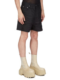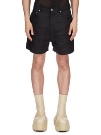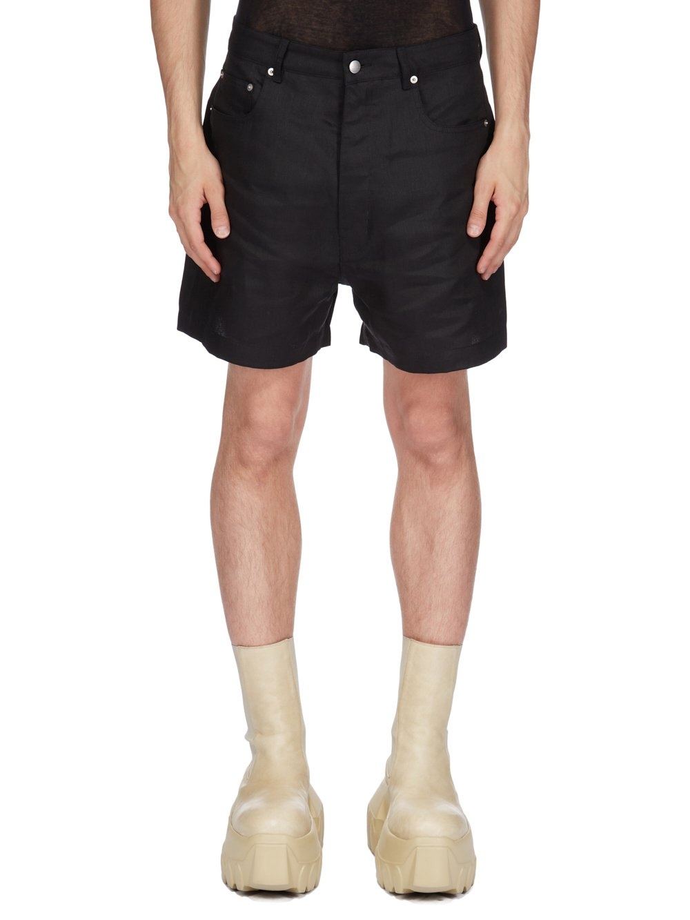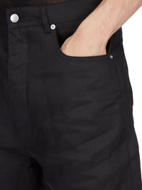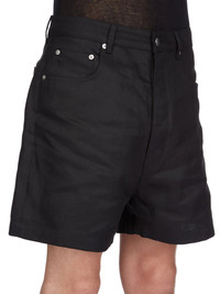 RICK OWENS SS25 HOLLYWOOD GETH CUTOFFS IN BLACK LINEN TWILL THESE GETH CUTOFFS ARE ABOVE A KNEE-LENGTH, 5 POCKET JEAN SHORT WITH A MID-RISE AND WIDE FIT. THEY HAVE A SILVER BUTTON FLY, A WAISTBAND WITH BELT LOOPS AND POCKET RIVETS. THEY HAVE SIDE SEAM SPLITS, REAR PATCH POCKETS AND TOPSTITCHING. THIS MEDIUMWEIGHT LINEN TWILL IS WOVEN WITH HIGH TWISTED LINEN YARNS. IT IS COMPACT WITH A RIGID HANDFEEL AND A SEMI SHINY SURFACE. LINEN IS CONSIDERED TO BE ONE OF THE NATURALLY MOST SUSTAINABLE FIBRES USED FOR TEXTILES. LINEN IS MADE FROM FLAX WHICH REQUIRES MUCH LESS WATER THAN COTTON, CAN BE GROWN WITH VERY LITTLE FERTILISER AND NO PESTICIDES. THE ENTIRE FLAX PLANT CAN BE USED TO MAKE LINEN FIBRE WHICH LOWER THE WASTE IN THE SPINNING PROCESS. COLOR: BLACK MATERIAL: 100% LINEN MODEL IS 189CM TALL MODEL WEARS SIZE 31