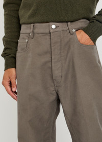 Info & Care Rick Owens brushed denim jeans High-rise fit, wide-leg cut, five pockets, belt loops, pressed crease through legs Partially conecaled button fastenings at front 100% cotton Dry clean Size & Fit Inside leg length: 28 inches/ 71cm Midweight Wide-leg cut Model is 6'1"/ 186cm;and wears a size;W32