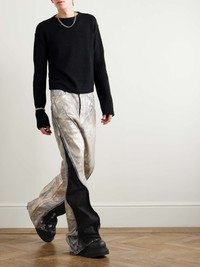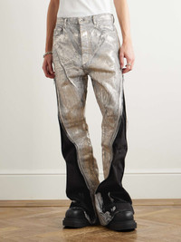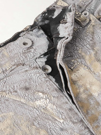 Rick Owens' 'Bolan' jeans are hand-pressed with gold-tone foil that looks painted on. They're cut with flared legs that pool at the hems and have zips at the sides so you can alter the shape. Lean into the brand's grungy aesthetic with a pair of punk-inspired boots. Size & Fit - Fits true to size. Take your normal size - Relaxed cut; flared at the hem, low-crotch style - Mid-weight, non-stretchy fabric denim - Model is shown wearing a 30 - Model measures: waist size 30, height 6'2"/ 188cm Details & Care - Grey, gold and black denim - Button fastenings - 91% cotton, 6% elastomultiester, 3% rubber - Dry clean