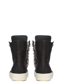 RICK OWENS FW25 CONCORDIANS JUMBOLACE SNEAKERS IN BLACK/MILK NUBUCK THESE JUMBOLACE SNEAKERS ARE ABOVE-ANKLE HEIGHT AND FEATURE EYELETS, JUMBO LACES, A ZIPPER ON THE INSIDE ANKLE FOR EASY FASTENING, TOE CAPS AND SHARK-TOOTHED BUMPER SOLES THIS HEAVYWEIGHT BULL LEATHER HAS A BRUSHED NUBUCK FINISH AND WAXY HANDFEEL. BECAUSE THIS SKIN IS NAKED, NOT FINISHED USING ANY PIGMENTS COVERING THE SKIN, NATURAL MARKINGS AND SHADINGS ARE VISIBLE WHICH MAKES EACH SKIN AND PRODUCT UNIQUE. THIS TANNERY IS LWG CERTIFIED WITH A SILVER RATING COLOR: BLACK/MILK UPPER 100% CALF LEATHER SOLE 100% THERMOPLASTIC POLYURETHANE