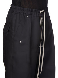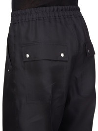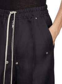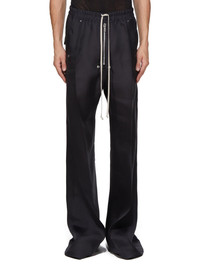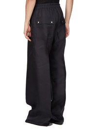RICK OWENS SS25 HOLLYWOOD RUNWAY WIDE BELA PANTS IN BLACK SILK GAZAR THESE WIDE BELA PANTS ARE FULL-LENGTH WITH A LOW CROTCH AND WIDE LEG. THEY FEATURE AN ELASTICIZED WAISTBAND WITH DRAWSTRING AND A BELA EXPOSED CENTER ZIPPER WITH TWO SNAP DETAIL AT BOTTOM. THEY HAVE SIDE WELT POCKETS WITH RIVET AND EYELET DETAIL AND BACK POCKETS WITH FLAPS AND SNAP CLOSURES THIS LIGHTWEIGHT AND SEMI-TRANSPARENT SILK GAZAR FABRIC HAS A DRY AND STIFF HANDFEEL. IT IS WOVEN IN THE COMO REGION OF ITALY KNOWN FOR ITS HERITAGE OF SILK PRODUCTION COLOR: BLACK MATERIAL: 100% SILK MODEL IS 189CM TALL MODEL WEARS SIZE 48