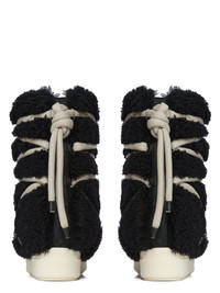 RICK OWENS FW25 CONCORDIANS MEGA BUMPER LUNAR IN BLACK/MILK CURLY SHEARLING THESE MEGA BUMPER LUNAR ARE ABOVE-ANKLE HEIGHT. THEY HAVE A SOFT PADDED PULL ON BOOT UPPER AND DOUBLE HEIGHT, SHARK-TOOTHED MEGA BUMPER SOLES THIS HEAVYWEIGHT SHEARLING LAMB LEATHER HAS A WAXY NAPPA FINISH AND A SOFT NATURAL FUR TANNED IN THE TUSCANY AREA OF ITALY, THESE SHEARLING MERINO HIDES ARE OF SPANISH ORIGIN, THE UNIQUE THICK FUR OF THESE ANIMALS MAKE THEM PERFECT FOR SHEARLING. BECAUSE THE HAIR IS NATURAL, THERE WILL BE VARIATIONS IN HAIR LENGTH AND TEXTURE, MAKING EACH PIECE UNIQUE THIS TANNERY IS LWG CERTIFIED WITH A SILVER RATING COLOR: BLACK/MILK MATERIAL: UPPER 100% LAMB SHEARLING REAL FUR LINING 100% NYLON PADDING 70% POLYURETHANE + 30% POLYESTER INSOLE 100% CALF LEATHER SOLE 100% THERMOPLASTIC RUBBER SOLE HEIGHT 4.5CM
