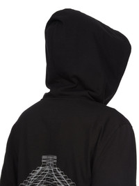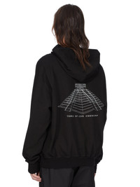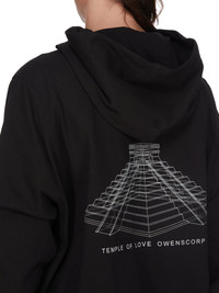 RICK OWENS SS26 TEMPLE HOODIE IN BLACK/MILK HEAVY JERSEY THIS HOODIE IS BELOW-HIP LENGTH WITH LONG SLEEVES, LOW SHOULDERS AND AN AMPLE FIT. IT HAS A BIG HOOD WITH DRAWSTRINGS, AND RIBBED CUFFS AND HEM. THIS VERSION FEATURES THE TEMPLE OF LOVE OWENSCORP TEMPLE PRINT. THIS HEAVYWEIGHT JERSEY IS COMPACT WITH A DRY HANDFEEL. THIS JERSEY IS MADE USING GOTS CERTIFIED ORGANIC COTTON WHICH MEANS THE NATURAL FIBER IS GROWN WITHOUT HARMFUL CHEMICALS, LEAVING OUR SOIL, AIR AND WATER CLEANER FROM CONTAMINATES. COLOR: BLACK/MILK MATERIAL:100% COTTON MODEL IS 189CM TALL MODEL WEARS SIZE S