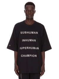 CHAMPION X RICK OWENS SS25 TOMMY T IN BLACK COTTON JERSEY IT FEATURES A 3D EMBROIDERED SIGNATURE CHAMPION X RICK OWENS SUBHUMAN, INHUMAN, SUPERHUMAN, CHAMPION LOGO ON FRONT AND CHAMPION LOGO ON RIGHT SLEEVE THIS MEDIUMWEIGHT CLASSIC COTTON JERSEY IS COMPACT WITH A DRY HANDFEEL THIS JERSEY IS MADE USING CERTIFIED ORGANIC COTTON WHICH MEANS THE NATURAL FIBER IS GROWN WITHOUT HARMFUL CHEMICALS, LEAVING OUR SOIL, AIR AND WATER CLEANER FROM CONTAMINATES COLOR: BLACKMATERIAL: 100% COTTON MODEL WEARS SIZE M MODEL IS 189CM TALL