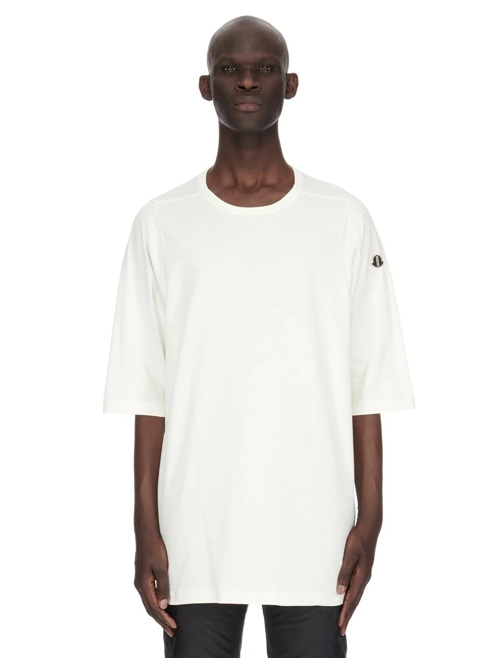 MONCLER + RICK OWENS FW24 CREWNECK SS T IN MILK BRUSHED JERSEY THIS CREWNECK SS T IS HIP LENGTH WITH ELBOW LENGTH SHORT SLEEVES. IT HAS A RIBBED ROUND NECK AND LEVEL SHOULDER SEAMS. IT FEATURES THE SIGNATURE SINGLE SEAM RUNNING DOWN THE CENTRE BACK SPINE. IT HAS THE MONCLER + RICK OWENS EMBROIDERED LOGO PATCH ON THE UPPER LEFT ARM THIS MEDIUMWEIGHT CLASSIC COTTON JERSEY IS COMPACT WITH A SOFT HAND FEEL AND SLIGHTLY BRUSHED SURFACE.THIS JERSEY IS MADE USING CERTIFIED ORGANIC COTTON - COLOR: MILK - MATERIAL: 100% COTTON - MALE MODEL IS 189 CM TALL, FEMALE MODEL IS 181 CM TALL - MODELS ARE WEARING SIZE M