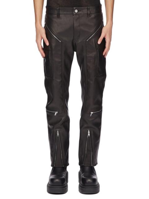 RICK OWENS FW25 CONCORDIANS RUNWAY HEADON JEANS IN BLACK HYBRID HORSE LEATHER THESE HEADON JEANS ARE ANKLE LENGTH AND HAVE A STRAIGHT FIT. THEY HAVE A CONCEALED ZIP FLY WITH TOP BUTTON, SIDE POCKETS, DIAGONAL STROBE ZIPPERED POCKETS, VERTICAL UTILITY POCKETS, AND REAR POCKETS WITH FLAPS. THEY HAVE SIDE KNEE ZIPS THAT CAN BE WORN OPEN AND FRONT SHIN ZIPPERS, ALLOWING THEM ALLOWS TO BE WORN STRAIGHT OR TAPERED THIS HEAVYWEIGHT HORSE LEATHER IS TANNED IN JAPAN. THE TANNING AND DYING METHOD OF THIS LEATHER WILL REVEAL THE BROWN COLOURED UNDERLAYER OF THE HIDE AS THE DARKER OUTER LAYER FADES WITH WEAR AND ABRASION. THE HIDES HAVE BEEN SPECIFICALLY CHOSEN FOR THE NATURAL SCARRING AND MARKINGS OF THE ANIMAL COLOR: BLACK MATERIAL: 100% HORSE LEATHER LINING 50% COTTON + 50% CUPRO MODEL IS 189CM TALL MODEL WEARS SIZE 48
