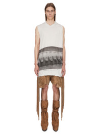 RICK OWENS SS26 TEMPLE RICK'S JUMBO SL T IN MILK WASH/BLACK COTTON GAUZE JERSEY THIS RICK'S JUMBO SS T IS BELOW-HIP LENGTH WITH AN OVERSIZED FIT. IT HAS A RIBBED CREWNECK AND ELBOW-LENGTH SHORT SLEEVES. IT FEATURES SIGNATURE FRONT LEVEL SHOULDER SEAMS AND A CENTER BACK SEAM. THIS VERSION FEATURES THE URINAL PRINT. THIS LIGHTWEIGHT AND AIRY COTTON GAUZE JERSEY IS SEMI TRANSPARENT AND HAVE A SOFT WASHED HAND FEEL. THIS JERSEY IS GARMENT DYED. THIS FABRIC IS MADE USING GOTS CERTIFIED ORGANIC COTTON WHICH MEANS THE NATURAL FIBER IS GROWN WITHOUT HARMFUL CHEMICALS, LEAVING OUR SOIL, AIR AND WATER CLEANER FROM CONTAMINATES. COLOR: MILK WASH/BLACK MATERIAL:100% COTTON MODEL IS 189CM TALL MODEL WEARS SIZE S