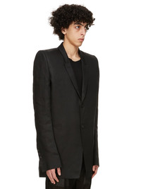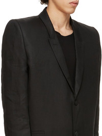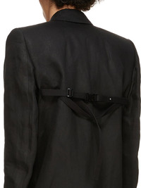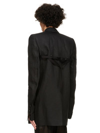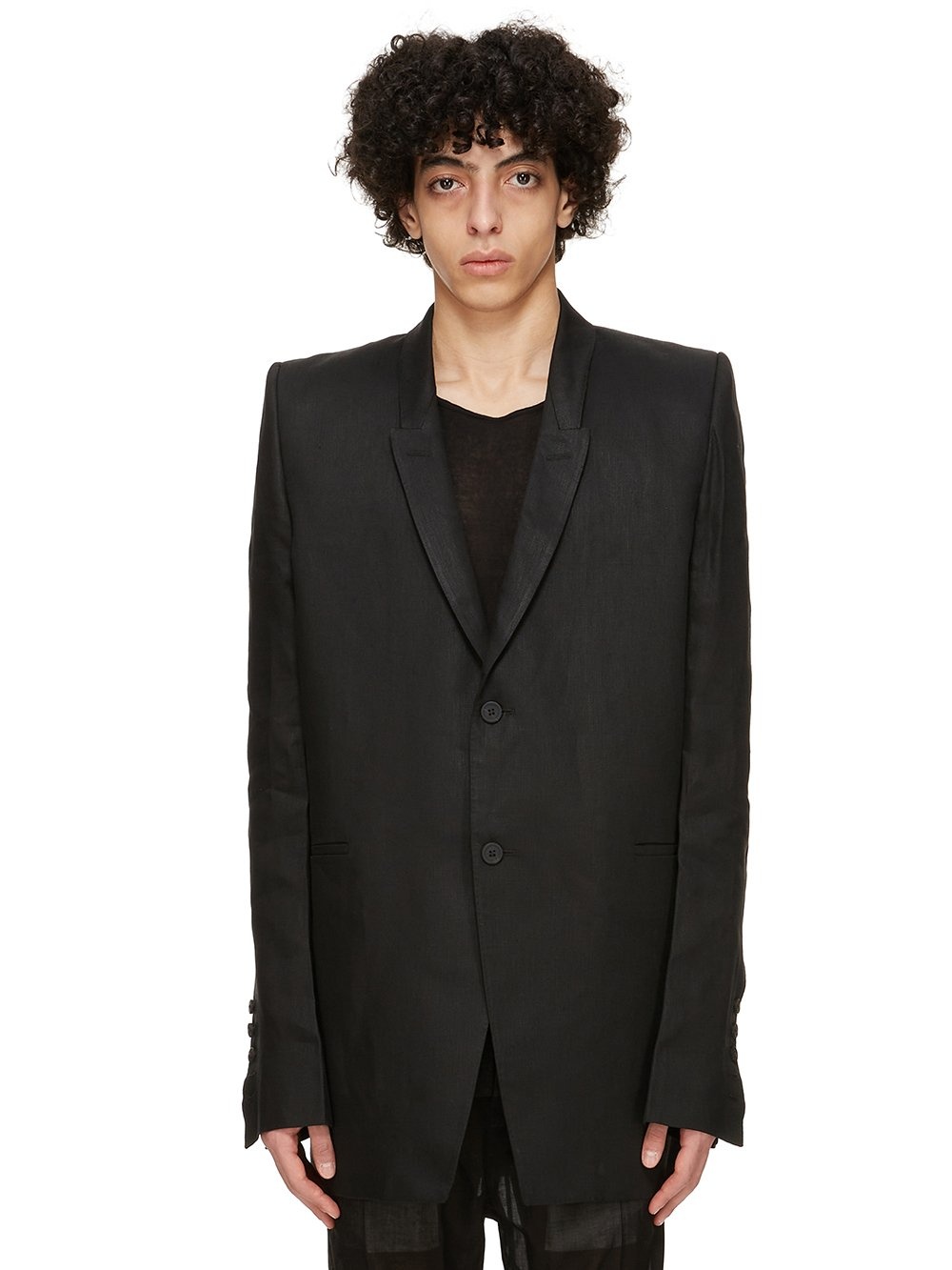 RICK OWENS SS25 HOLLYWOOD DIRT TAILORED LS IN BLACK LINEN TWILL THIS DIRT TAILORED LS JKT IS BELOW-HIP LENGTH WITH A REGULAR SHOULDER PAD AND LONG SLEEVES. IT HAS A SLIM LAPEL WITH TWO BUTTON FRONT CLOSURE AND SIDE FRONT JET POCKETS. IT HAS A CENTER BACK VENT AND FEATURES A THIN, ADJUSTABLE, COTTON WEBBING DISCO STRAP, WITH CLIP, ACROSS THE BACK YOKE IT IS FULLY LINED AND HAS TWO INTERNAL BUTTONED POCKETS. THIS MEDIUMWEIGHT LINEN TWILL IS WOVEN WITH HIGH TWISTED LINEN YARNS. IT IS COMPACT WITH A RIGID HANDFEEL AND A SEMI SHINY SURFACE. LINEN IS CONSIDERED TO BE ONE OF THE NATURALLY MOST SUSTAINABLE FIBRES USED FOR TEXTILES. LINEN IS MADE FROM FLAX WHICH REQUIRES MUCH LESS WATER THAN COTTON, CAN BE GROWN WITH VERY LITTLE FERTILISER AND NO PESTICIDES. THE ENTIRE FLAX PLANT CAN BE USED TO MAKE LINEN FIBRE WHICH LOWER THE WASTE IN THE SPINNING PROCESS. COLOR: BLACK MATERIAL: 100% LINEN LINING 100% CUPRO BUTTONS 100% BUFFALO HORN MODEL IS 189CM TALL MODEL WEARS SIZE 48