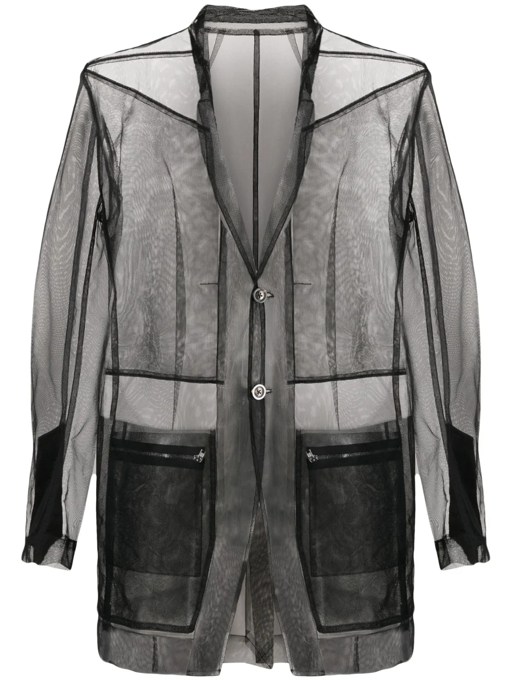 sheer buttoned shirt Highlights - Black - Sheer construction - Vertical seamed - Collarless - Front button fastening - Long sheer sleeves - Front zip fastening pockets - Straight hem Made in Italy Composition Polyamide 100% SIZE & FIT Model measurements Height 6 ft 2 in(1.87 m) Bust/Chest 36.41 in(92.5 cm) Hips 37 in(94 cm) Waist 29.52 in(75 cm) FittingInformation Designed for a slim fit, offering a comfortable fit that sits just away from the body Made from a lightweight non-stretch fabric, this piece offers minimal elasticity when worn This piece fits true to size – take your usual size Washing instructions Dry Clean Only
