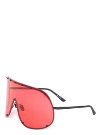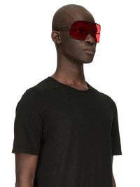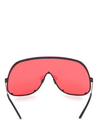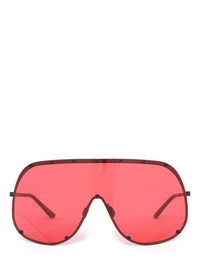 RICK OWENS SHIELD SUNGLASSES THESE SHIELD SUNGLASSES FEATURE A SURGICAL STAINLESS STEEL FRAME, A SINGLE VOLUMINOUS CURVED CORRESPONDING LENS SECURED WITH SCREWS AND A RUBBER NOSE PAD. THEY HAVE SLIM METAL ARMS WITH THE RICK OWENS LOGO ON THE INSIDE RIGHT TEMPLE. NOT SUITABLE FOR CONVERSION INTO PRESCRIPTION GLASSES - COLOR: BLACK, RED - FRAME: 100% STAINLESS STEEL - LENSES: 100% NYLON - MEASURES: 20CM X 8CM X 6CM -NOT SUITABLE FOR CONVERSION INTO PRESCRIPTION GLASSES