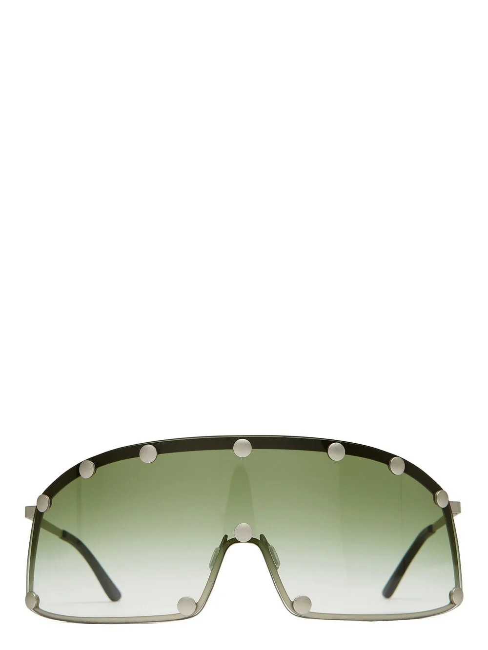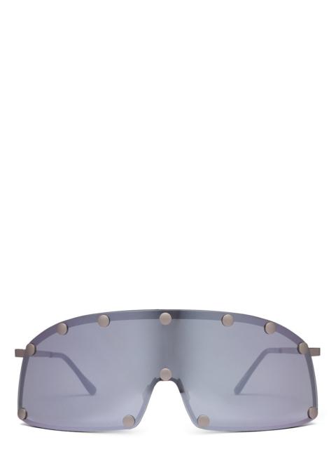 RICK OWENS FW25 CONCORDIANS SHIELDING SUNGLASSES THESE SHIELDING SUNGLASSES FEATURE A METAL FRAME, A SINGLE CORRESPONDING LENS WITH A CURVED TOP AND STRAIGHT BOTTOM SECURED WITH SCREWS AND A RUBBER NOSE PAD. THEY HAVE SLIM METAL ARMS WITH THE RICK OWENS LOGO ON THE INSIDE RIGHT TEMPLE COLOR: SILVER, BOSCO FRAME: 100% STAINLESS STEEL LENSES: 100% NYLON