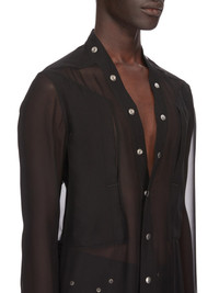 RICK OWENS SS24 LIDO LARRY FOGPOCKET SHIRT IN BLACK SILK CHIFFON THIS LARRY FOGPOCKET SHIRT IS HIP LENGTH AND HAS LONG SLEEVES WITH SNAP CUFFS. IT HAS A DEEP V NECK WITH FOUR FUNCTIONAL VISIBLE SNAP CLOSURES, AND SNAPS CONTINUING AROUND TO THE CENTRE BACK NECK. IT FEATURES TWO FOG BREAST POCKETS WITH A VERTICAL OPENING AND INTERNAL SNAP. IT HAS LEVEL SHOULDER SEAMS, A BACK YOKE AND A HEMLINE WITH BEVELED SIDESTHIS FABRIC IS TRANSPARENT THIS LIGHTWEIGHT AND SEMI-TRANSPARENT SILK CHIFFON IS FLUID WITH A MATTE SURFACE AND DRY HANDFEEL. IT IS WOVEN IN THE COMO REGION OF ITALY KNOWN FOR ITS HERITAGE OF SILK PRODUCTION. THIS FABRIC IS MADE USING GOTS CERTIFIED ORGANIC SILK BECAUSE IT MEANS THE NATURAL FIBER IS MADE WITHOUT HARMFUL CHEMICALS, WHICH LEAVES OUR SOIL, AIR AND WATER CLEANER FROM CONTAMINATES - COLOR: BLACK - MATERIAL: 100% SILK - MODEL IS 189CM TALL - MODEL WEARS SIZE 48
