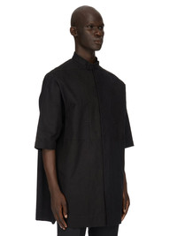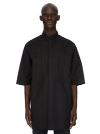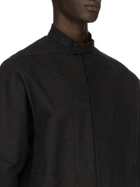 RICK OWENS FW23 LUXOR EDFU MAGNUM IN BLACK HEAVY MOLESKIN THIS EDFU MAGNUM SHIRT IS MID THIGH LENGTH WITH ELBOW LENGTH SLEEVES AND A WIDE BOXY FIT. IT HAS A CENTRE FRONT OPENING WITH CONCEALED SNAP CLOSURES, AND A STRUCTURED PRIESTS' COLLAR. IT HAS A HEMLINE WITH BEVELED SIDE SPLITS AND TWO FOG BREAST POCKETS WITH A VERTICAL OPENING AND CONCEALED SNAPS, TWO SIDE FRONT POCKETS AND TOPSTITCHING. IT FEATURES THE SIGNATURE LEVEL SHOULDER SEAMS IT IS FULLY LINED AND HAS TWO INTERNAL ZIPPERED POCKETS THIS HEAVYWEIGHT COTTON MOLESKIN HAS A STIFF HANDFEEL AND BRUSHED FINISH. THIS FABRIC IS MADE USING GOTS CERTIFIED ORGANIC COTTON WHICH MEANS THE NATURAL FIBER IS GROWN WITHOUT HARMFUL CHEMICALS, LEAVING OUR SOIL, AIR AND WATER CLEANER FROM CONTAMINATES - COLOR: BLACK - MATERIAL: 100% COTTON - YOKE LINING 100% COTTON - MODEL IS WEARING SIZE 48 - MODEL IS 189 CM TALL