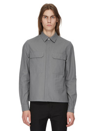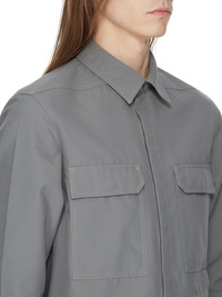 RICK OWENS SS24 LIDO CROPPED OUTERSHIRT IN SMOKE RECYCLED POLYESTER TWILL THIS CROPPED OUTERSHIRT IS WAIST-LENGTH WITH A BOXY FIT. IT HAS A CENTRE FRONT OPENING WITH VISIBLE SNAP CLOSURES, A CLASSIC SHIRT COLLAR, BEVELED SIDE SEAMS, SNAP CUFFS AND DOUBLE TOPSTITCHING. IT FEATURES TWO SQUARE CHEST POCKETS WITH BEVELED FLAPS, SIGNATURE LEVEL SHOULDER SEAMS AND A COTTON WEBBING STRAP WITH RIVET DETAIL ON THE BACK YOKE. THIS ITEM IS PART OF THE RICK OWENS BONOTTO CAPSULE COLLECTION AND FEATURES A SIGNATURE LABEL ON THE INTERIOR THIS MEDIUM WEIGHT TECHNICAL TWILL IS COMPACTLY WOVEN AND HAS A SOFT, SLIGHTLY BRUSHED FINISH. IT IS WOVEN FROM CERTIFIED RECYCLED POLYESTER WHICH ENSURES A REDUCTION IN WATER CONSUMPTION, EMISSIONS AND HAZARDOUS WASTE, LESSENING THE DEPENDENCE ON NON-RENEWABLE RESOURCES. THIS FABRIC WAS WOVEN ON A 1950’S VINTAGE SHUTTLE LOOM BY BONOTTO, A 4TH GENERATION TEXTILE MILL FOUNDED IN 1912 SITUATED JUST BELOW THE PREALPS IN VENETO, ITALY. - COLOR: SMOKE - MATERIAL: 100% POLYESTER - YOKE LINING 100% COTTON - MODEL IS 189CM TALL - MODEL WEARS SIZE 48