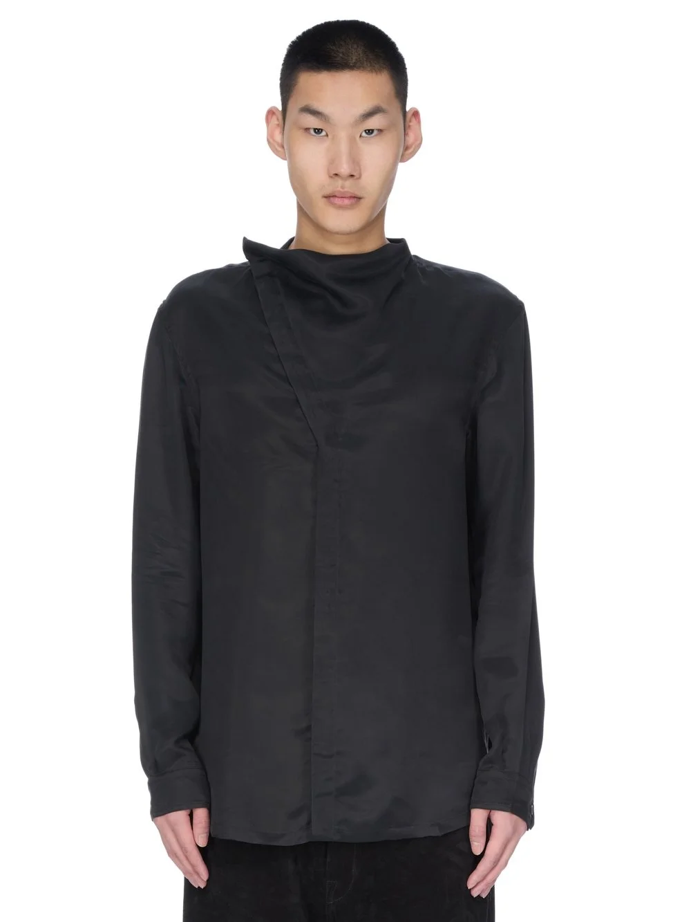 RICK OWENS FW25 CONCORDIANS ISLAND SHIRT IN BLACK WASHED CUPRO THIS ISLAND SHIRT IS HIP-LENGTH WITH LONG SLEEVES AND SINGLE BUTTON CUFFS. IT FEATURES A FRONT OPENING WITH CONCEALED BUTTON CLOSURES THAT VEERS TO THE RIGHT, UNDER THE CHIN, AND INTO A POINT, CREATING A SLIGHT DRAPE AT FRONT AND A SMALL, ROUNDED, FUNNEL NECK AT BACK IT HAS A BACK YOKE AND A HEMLINE WITH BEVELED SIDE SPLITS THIS MEDIUMWEIGHT WASHED CUPRO SATIN IS FLUID AND FINISHED WITH ENZYMES WHICH GIVES THIS FABRIC ITS PEACH HANDFEEL THIS FABRIC IS MADE USING CUPRO WHICH IS BIODEGRADABLE AND 100% PLANT BASED. AS IT’S MADE FROM COTTON WASTE, CUPRO HELPS FIND A PURPOSE TO FIBERS THAT WOULD OTHERWISE BE DISCARDED COLOR: BLACK MATERIAL: 100% CUPRO BUTTONS 100% BUFFALO HORN MODEL IS 189CM TALL MODEL WEARS SIZE 48