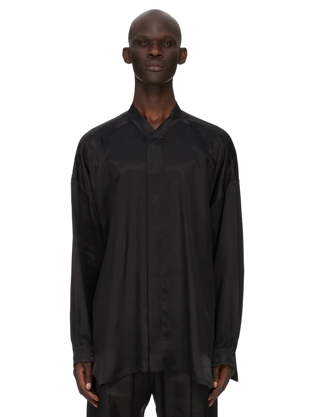 RICK OWENS FW25 CONCORDIANS JUMBO FAUN SHIRT IN BLACK WASHED CUPRO THIS JUMBO FAUN SHIRT IS HIP LENGTH WITH LONG SLEEVES AND AN OVERSIZED BOXY FIT. IT HAS A CENTRE FRONT OPENING WITH CONCEALED SNAP CLOSURES, A SLIGHT V NECK WITH FLAT COLLAR, AND SNAP CUFFS. IT FEATURES LEVEL SHOULDER SEAMS, BACK YOKE AND A HEMLINE WITH BEVELED SIDES THIS MEDIUMWEIGHT WASHED CUPRO SATIN IS FLUID AND FINISHED WITH ENZYMES WHICH GIVES THIS FABRIC ITS PEACH HANDFEEL THIS FABRIC IS MADE USING CUPRO WHICH IS BIODEGRADABLE AND 100% PLANT BASED. AS IT’S MADE FROM COTTON WASTE, CUPRO HELPS FIND A PURPOSE TO FIBERS THAT WOULD OTHERWISE BE DISCARDED COLOR: BLACK MATERIAL: 100% CUPRO MODEL IS 189CM TALL MODEL WEARS SIZE 48