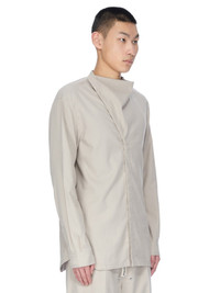 RICK OWENS FW25 CONCORDIANS ISLAND SHIRT IN PEARL WOOL FLANNEL THISLAND SHIRT IS HIP-LENGTH WITH LONG SLEEVES AND SINGLE BUTTON CUFFS. IT FEATURES A FRONT OPENING WITH CONCEALED BUTTON CLOSURES THAT VEERS TO THE RIGHT, UNDER THE CHIN, AND INTO A POINT, CREATING A SLIGHT DRAPE AT FRONT AND A SMALL, ROUNDED, FUNNEL NECK AT BACK IT HAS A BACK YOKE AND A HEMLINE WITH BEVELED SIDE SPLITS THIS LIGHTWEIGHT WOOL AND COTTON BLEND FLANNEL HAS A SOFT AND BRUSHED HANDFEEL THIS FABRIC IS MADE USING GOTS CERTIFIED ORGANIC COTTON AND RWS CERTIFIED WOOL COLOR: PEARL MATERIAL: 81% COTTON + 19% WOOL BUTTONS 100% BUFFALO HORN MODEL IS 189CM TALL MODEL WEARS SIZE 48