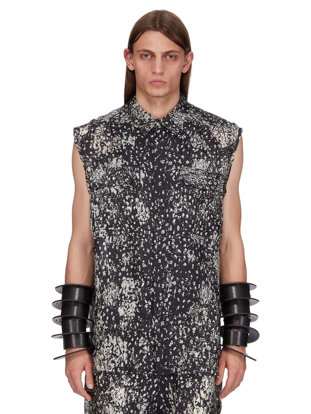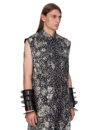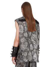 RICK OWENS SS25 HOLLYWOOD JUMBO SL OUTERSHIRT IN BLACK/PEARL WOLFFISH PRINTED JAPONETTE THIS JUMBO SL OUTERSHIRT IS BELOW-HIP LENGTH AND SLEEVELESS WITH A JUMBO BOXY FIT. IT HAS A CLASSIC COLLAR AND VISIBLE SNAP FRONT CLOSURES, BEVELED SIDE SEAMS AND DOUBLE TOPSTITCHING. IT FEATURES SIGNATURE LEVEL SHOULDER SEAMS AND A COTTON WEBBING STRAP WITH RIVET DETAIL ON THE BACK YOKE THIS LIGHTWEIGHT AND FLUID JAPONETTE HAS A COOL HANDFEEL AND IS DIGITALLY PRINTED WITH OUR SEASONAL WOLFFISH MOTIF. THIS FABRIC IS MADE USING CUPRO WHICH IS BIODEGRADABLE AND 100% PLANT BASED. AS IT’S MADE FROM COTTON WASTE, CUPRO HELPS FIND A PURPOSE TO FIBERS THAT WOULD OTHERWISE BE DISCARDED COLOR: BLACK/PEARL MATERIAL: 100% CUPRO YOKE LINING 100% COTTON MODEL IS 189CM TALL MODEL WEARS SIZE 48