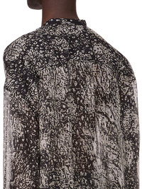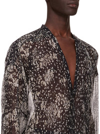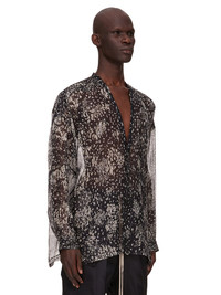 RICK OWENS SS25 HOLLYWOOD LIDO LARRY SHIRT IN BLACK/PEARL WOLFFISH PRINTED SILK CHIFFON THIS LIDO LARRY SHIRT IS MID-THIGH LENGTH WITH LONG SLEEVES. IT HAS A DEEP V NECK AND CENTER FRONT OPENING WITH CONCEALED SNAP CLOSURES. IT HAS LEVEL SHOULDER SEAMS, A BACK YOKE AND CUFFS WITH CONCEALED SNAPS THIS LIGHTWEIGHT AND SEMI-TRANSPARENT SILK CHIFFON IS FLUID WITH A MATTE SURFACE AND DRY HANDFEEL. IT IS WOVEN AND DIGITALLY PRINTED WITH OUR SEASONAL WOLFFISH MOTIF IN THE COMO REGION OF ITALY KNOWN FOR ITS HERITAGE OF SILK PRODUCTION. COLOR: BLACK/PEARL MATERIAL: 100% SILK YOKE LINING 100% COTTON MODEL IS 189CM TALL MODEL WEARS SIZE 48