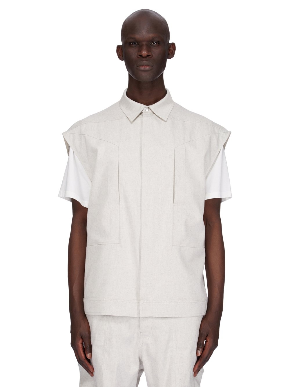 RICK OWENS SS25 HOLLYWOOD SLEEVELESS JUMBO OUTERSHIRT IN DINGE 10OZ DINGE DENIM THIS SLEEVELESS JUMBO OUTERSHIRT IS HIP LENGTH, SLEEVELESS AND HAS AN OVERSIZED BOXY FIT IT HAS A CENTER FRONT OPENING WITH VISIBLE SNAP CLOSURES, A CLASSIC SHIRT COLLAR, AND A WAISTBAND WITH TOPSTITCHING AND SIDE BACK SNAP DETAIL IT FEATURES TWO FOG BREAST POCKETS WITH A VERTICAL OPENING AND INTERNAL SNAP IT HAS THE SIGNATURE LEVEL SHOULDER SEAMS AND COTTON WEBBING STRAP WITH RIVET DETAIL ON THE BACK YOKE THIS LIGHTWEIGHT DINGE MELANGE DENIM HAS A WASHED AND SOFT FINISH COLOR: DINGE MATERIAL: 100% COTTON POCKETS CHEST LINING 100% COTTON MODEL IS 189CM TALL MODEL WEARS SIZE 48