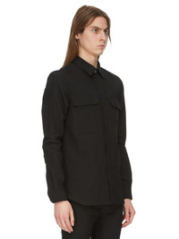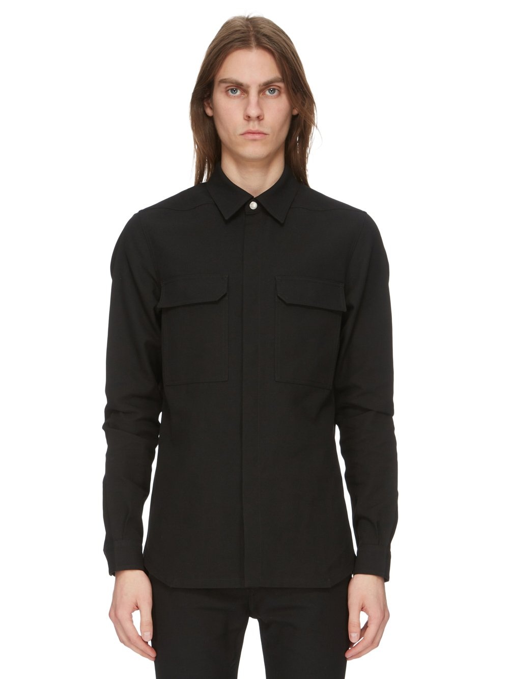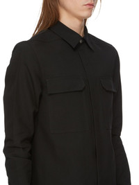 RICK OWENS FW23 LUXOR OUTERSHIRT IN RECYCLED POLYESTER TWILL THIS OUTERSHIRT IS BELOW HIP LENGTH WITH A BOXY FIT. IT HAS A CENTRE FRONT OPENING WITH CONCEALED SNAP CLOSURES, AND ONE VISIBLE SNAP AT THE NECK. IT HAS A CLASSIC SHIRT COLLAR, BEVELED SIDE SEAMS WITH SPLITS, CONCEALED SNAP CUFFS AND DOUBLE TOPSTITCHING. IT FEATURES TWO CHEST POCKETS WITH BEVELED EDGE FLAPS, CONCEALED SNAP CLOSURES AND THE SIGNATURE LEVEL SHOULDER SEAMSTHIS ITEM IS PART OF THE RICK OWENS BONOTTO CAPSULE COLLECTION AND FEATURES A SIGNATURE LABEL ON THE INTERIOR THIS TECHNICAL TWILL IS COMPACTLY WOVEN AND HAS A SOFT, SLIGHTLY BRUSHED FINISH. IT IS WOVEN FROM CERTIFIED RECYCLED POLYESTER WHICH ENSURES A REDUCTION IN WATER CONSUMPTION, EMISSIONS AND HAZARDOUS WASTE, LESSENING THE DEPENDENCE ON NON-RENEWABLE RESOURCES. THIS FABRIC WAS WOVEN ON A 1950’S VINTAGE SHUTTLE LOOM BY BONOTTO, A 4TH GENERATION TEXTILE MILL FOUNDED IN 1912 SITUATED JUST BELOW THE PREALPS IN VENETO, ITALY. - COLOR: BLACK - MATERIAL: 100% POLYESTER - YOKE LINING 100% COTTON - MODEL IS WEARING SIZE 48 - MODEL IS 189CM TALL
