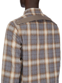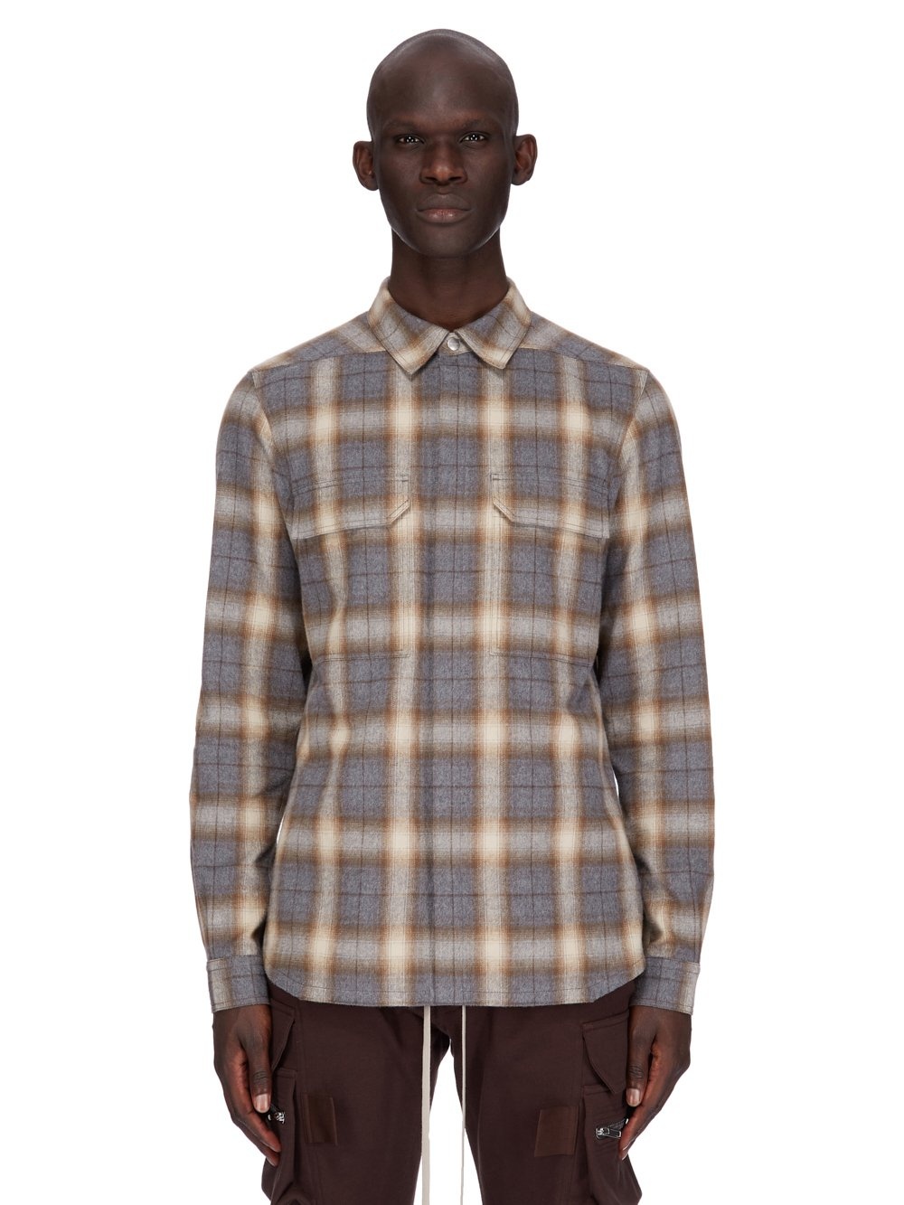 RICK OWENS SS25 HOLLYWOOD OUTERSHIRT IN GREY PLAID COTTON PLAID THIS OUTERSHIRT IS HIP LENGTH WITH A BOXY FIT. IT HAS A CENTER FRONT OPENING WITH CONCEALED SNAP CLOSURES, A CLASSIC SHIRT COLLAR, BEVELED SIDE SEAMS, SNAP CUFFS AND DOUBLE TOPSTITCHING. IT FEATURES TWO SQUARE CHEST POCKETS WITH BEVELED FLAPS, SIGNATURE LEVEL SHOULDER SEAMS AND A COTTON WEBBING STRAP WITH RIVET DETAIL ON THE BACK YOKE THIS LIGHTWEIGHT COTTON FLANNEL HAS A SOFT AND BRUSHED HANDFEEL. THE COLOR COMBINATION IS CREATED BY DYEING THE COTTON YARNS INDIVIDUALLY INTO FIVE DIFFERENT COLORS AND WEAVING THEM TOGETHER IN A PLAID PATTERN. COLOR: GREY PLAID MATERIAL: 100% COTTON MODEL IS 189CM TALL MODEL WEARS SIZE 48