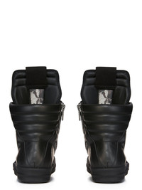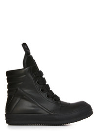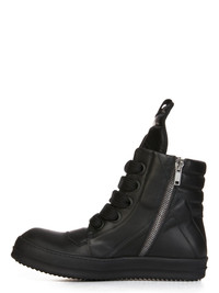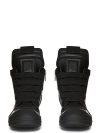 RICK OWENS SS24 LIDO JUMBO LACED GEOBASKET IN BLACK FULL GRAIN CALF LEATHER THESE JUMBO LACED GEOBASKETS ARE ABOVE-ANKLE HEIGHT. THEY FEATURE AN EXTENDED TONGUE WITH WEBBING TAB, SIGNATURE GEOMETRIC PANELS AND A PADDED BACK COUNTER WITH LINES OF TOPSTITCHING. THEY HAVE JUMBO LACES, A ZIPPER ON THE INSIDE ANKLE FOR EASY FASTENING AND SHARK-TOOTH SOLES THIS MEDIUMWEIGHT FULL GRAIN CALF LEATHER HAS A FLAT AND MATTE SURFACE FINISH AND IS SPECIFICALLY TANNED FOR SHOES WITH AN ABRASION-RESISTANT FINISH- COLOR: BLACK/BLACK/BLACK/BLACK - MATERIAL: UPPER 100% COW LEATHER - UPPER DETAIL 100% COW LEATHER - LINING 100% CALF LEATHER - INSOLE 100% CALF LEATHER - SOLE 100% THERMOPLASTIC RUBBER