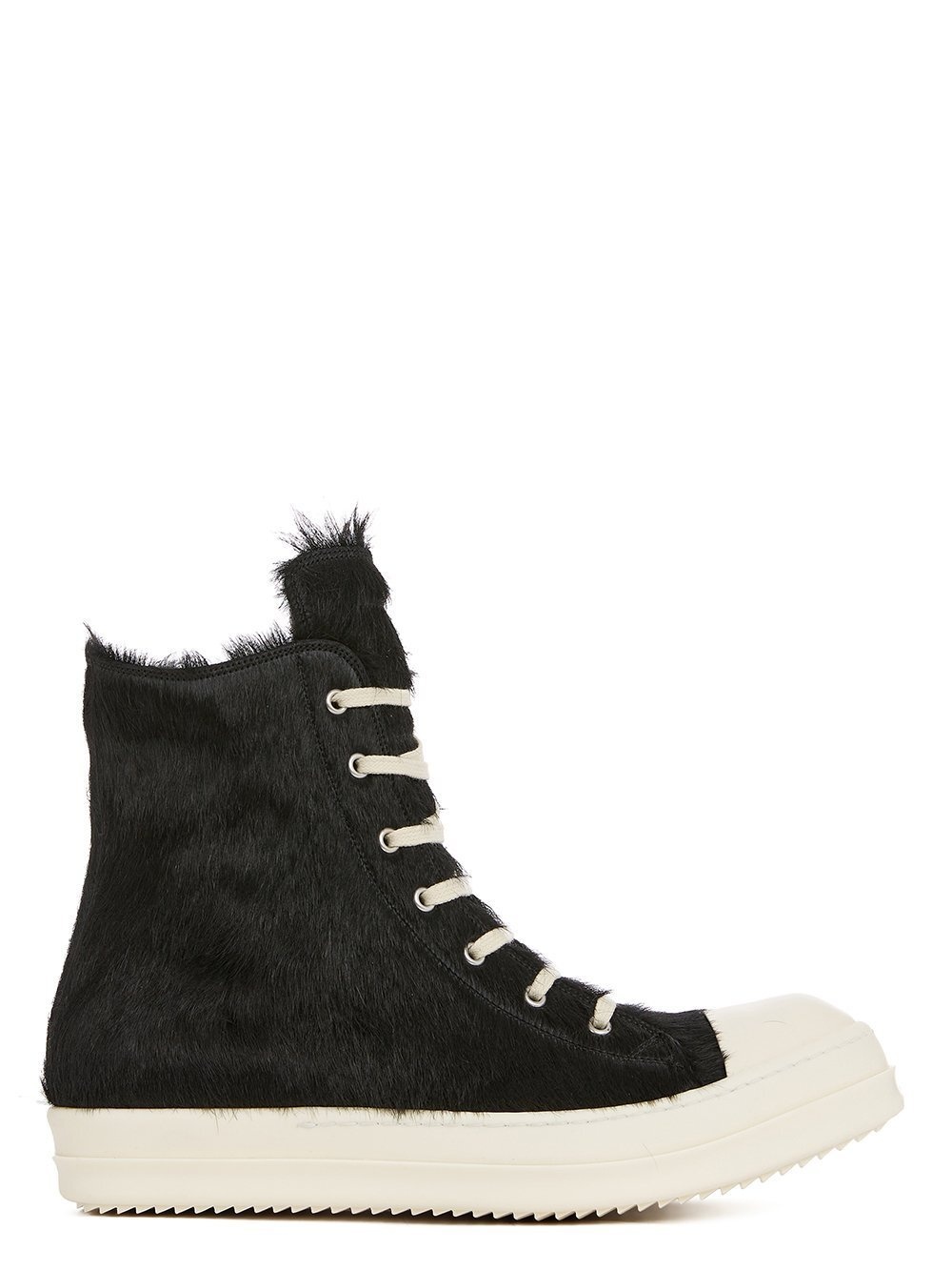 RICK OWENS SS24 LIDO RUNWAY SNEAKERS IN BLACK/MILK/MILK UNSHAVED COW LEATHER THESE SNEAKERS ARE ABOVE-ANKLE HEIGHT AND FEATURE SEVEN EYELETS, LACES, A ZIPPER ON THE INSIDE ANKLE FOR EASY FASTENING, TOE CAPS AND SHARK-TOOTH SOLESTHIS HEAVYWEIGHT LEATHER IS A HAIR-ON COWHIDE WITH NATURAL LENGTH COARSE HAIR. THIS LEATHER IS TANNED IN THE VENETO AREA OF ITALY BY A TANNERY SPECIALIZED IN HAIR-ON COW LEATHER. BECAUSE THE HAIR IS NATURAL THERE CAN BE INCONSISTENCY IN THE LENGTH DIRECTION, TEXTURE AND COLOR THIS TANNERY IS LWG CERTIFIED WITH A SILVER RATING. - COLOR: BLACK/MILK/MILK - MATERIAL: UPPER 100% COW REAL FUR - TOE 100% CALF LEATHER - LINING 100% CALF LEATHER - SOLE 100% THERMOPLASTIC RUBBER