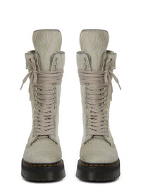 DR. MARTENS x RICK OWENS FW22 STROBE CALF LENGTH BOOT IN PEARL HAIR-ON COW LEATHER. THESE DR. MARTENS BOOTS ARE REIMAGINED BY RICK OWENS AND FEATURE EXAGGERATED LENGTH PEARL LACES AND PALLADIUM FINISH HARDWARE INCLUDING EYELETS, SPEED HOOKS AND SIDE ZIPPER. THE BOOT FEATURES AN EXTENDED GEOMETRIC TONGUE AND HAS A WOVEN DR MARTENS AIRWARE HEEL LOOP IN BLACK AND PEARL. THEY HAVE A 4CM HIGH DR MARTENS QUAD SOLE WITH THE DR MARTENS YELLOW WELT STITCH - COLOR: PEARL - MATERIAL: UPPER 100% COW REAL FUR - LINING: 100% COW LEATHER - INSOLE: 100% COW LEATHER - SOLE: 100% POLIVINILCLORURO PLEASE NOTE THE SHOE SIZE LISTED ON THE PRODUCT DESCRIPTION PAGE CORRESPONDS TO UK SHOE SIZE WE STRONGLY RECOMMEND OUR CLIENTS TO CHECK THE SIZE CHART BEFORE PLACING AN ORDER TO AVOID ANY POTENTIAL INCONVENIENCE FEEL FREE TO CONTACT CUSTOMERCARE@RICKOWENS.EU FOR ANY ASSISTANCE