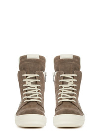 RICK OWENS FW22 STROBE GEOBASKET IN DUST AND MILK WHITE CROSTA SUEDE LEATHER THESE GEOBASKETS ARE ABOVE ANKLE HEIGHT. THEY HAVE SEVEN EYELETS WITH LACES, AN EXTENDED TONGUE, A ZIPPER ON THE INSIDE ANKLE FOR EASY FASTENING, GEOMETRIC SEAMS WITH TOPSTITCHING AND SHARK-TOOTH SOLES THIS HEAVYWEIGHT SUEDE LEATHER HAS A WAXY HANDFEEL - COLOR: DUST/MILK WHITE - MATERIAL: UPPER 100% COW LEATHER - DETAIL 100% CALF LEATHER - LINING 100% CALF LEATHER - INSOLE 100% CALF LEATHER - SOLE 100% RUBBER