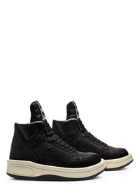 CONVERSE X DRKSHDW TURBOWPN IN BLACK AND WHITE THIS PREMIUM LEATHER UPPER LACED HIGH TOP SHOE IS BASED ON THE CLASSIC CONVERSE “WEAPON” MODEL ORIGINATING FROM THE MID 80’S AND FAMOUSLY WORN BY BASKET BALL PLAYER MAGIC JOHNSON. SIGNATURE DRKSHDW ELONGATED TONGUE WITH CUSTOM BRANDED WRAP AROUND WOVEN LABEL, BEARING THE MODEL NAME. BLACK LEATHER UPPER, WHITE SOLE AND BLACK OUTSOLE THE SHOE FEATURES AN EXAGGERATED FOAM MOLDED TOE AND OVERSIZED WEAPON TOOLING WITH SIGNATURE DRKSHDW SAWTOOTH OUTSOLE. CX FOAM INTERNAL MIDSOLE AND CX FOAM SOCKLINER PENTAGRAM COLLAB LOGO ON THE LATERAL QUARTER, AIR VENT PERFORATIONS ON TOE AND SIDE, AND COLLAB LOGO ON SOLE - UPPER: 100% COW LEATHER - INSOLE: 60% POLYURETHANE + 40% POLYESTER - SOLE: 100% RUBBER PLEASE NOTE THE SHOE SIZE LISTED ON THE PRODUCT DESCRIPTION PAGE CORRESPONDS TO USA MEN'S SHOE SIZE WE STRONGLY RECOMMEND OUR CLIENTS TO CHECK THE SIZE CHART BEFORE PLACING AN ORDER TO AVOID ANY POTENTIAL INCONVENIENCE FEEL FREE TO CONTACT CUSTOMERCARE@RICKOWENS.EU FOR ANY ASSISTANCE