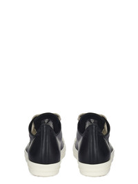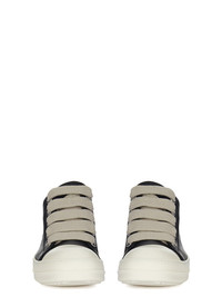 RICK OWENS SS26 TEMPLE JUMBOLACE LOW SNEAKS IN BLACK/MILK/MILK FULL GRAIN COW LEATHER THESE JUMBOLACE LOW SNEAKS ARE UNDER ANKLE HEIGHT AND FEATURE FIVE EYELETS, JUMBO LACES, TOE CAPS AND SHARK-TOOTHED BUMPER SOLES. THIS MEDIUMWEIGHT FULL GRAIN COW LEATHER HAS A FLAT AND MATTE SURFACE FINISH AND IS SPECIFICALLY TANNED FOR SHOES WITH AN ABRASION-RESISTANT FINISH. THIS TANNERY IS LWG CERTIFIED WITH A BRONZE RATING. COLOR: BLACK/MILK/MILK MATERIAL: UPPER 100% COW LEATHER TOE 100% CALF LEATHER LINING 100% CALF LEATHER INSOLE 100% CALF LEATHER SOLE 100% THERMOPLASTIC RUBBER SOLE HEIGHT 3.5CM