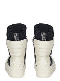 RICK OWENS SS26 TEMPLE MEGA BUMPER GEOBASKET IN BLACK/MILK/MILK FULL GRAIN COW LEATHER THESE MEGA BUMPER GEOBASKETS ARE ABOVE-ANKLE HEIGHT. THEY FEATURE AN EXTENDED TONGUE WITH WEBBING TAB, SIGNATURE GEOMETRIC PANELS AND A PADDED BACK COUNTER WITH LINES OF TOPSTITCHING. THEY HAVE 7 EYELETS WITH CONTRAST LACES, A ZIPPER ON THE INSIDE ANKLE FOR EASY FASTENING AND DOUBLE HEIGHT, MEGA BUMPER SHARK-TOOTHED SOLES THIS MEDIUMWEIGHT FULL GRAIN COW LEATHER HAS A FLAT AND MATTE SURFACE FINISH AND IS SPECIFICALLY TANNED FOR SHOES WITH AN ABRASION-RESISTANT FINISH THIS TANNERY IS LWG CERTIFIED WITH A BRONZE RATING COLOR: BLACK/MILK/MILK MATERIAL: UPPER 100% COW LEATHER LINING 100% CALF LEATHER INSOLE 100% CALF LEATHER SOLE 100% THERMOPLASTIC RUBBER SOLE HEIGHT 4.5CM