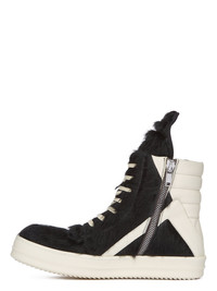 RICK OWENS SS24 LIDO RUNWAY GEOBASKET IN BLACK/MILK/MILK UNSHAVED COW LEATHER AND FULL GRAIN CALF LEATHER THESE GEOBASKETS ARE ABOVE-ANKLE HEIGHT. THEY FEATURE AN EXTENDED TONGUE WITH WEBBING TAB, SIGNATURE GEOMETRIC PANELS AND A PADDED BACK COUNTER WITH LINES OF TOPSTITCHING. THEY HAVE CONTRAST LACES, A ZIPPER ON THE INSIDE ANKLE FOR EASY FASTENING, AND SHARK-TOOTH SOLESTHIS IS A COMBINATION OF UNSHAVED COW LEATHER AND FULL GRAIN CALF LEATHER THIS HEAVYWEIGHT LEATHER IS A HAIR-ON COWHIDE WITH NATURAL LENGTH COARSE HAIR. THIS LEATHER IS TANNED IN THE VENETO AREA OF ITALY BY A TANNERY SPECIALIZED IN HAIR-ON COW LEATHER. BECAUSE THE HAIR IS NATURAL THERE CAN BE INCONSISTENCY IN THE LENGTH DIRECTION, TEXTURE AND COLOR THIS TANNERY IS LWG CERTIFIED WITH A SILVER RATING. - COLOR: BLACK/MILK/MILK - MATERIAL: UPPER 100% COW REAL FUR - DETAIL 100% COW LEATHER - LINING 100% CALF LEATHER - SOLE 100% THERMOPLASTIC RUBBER