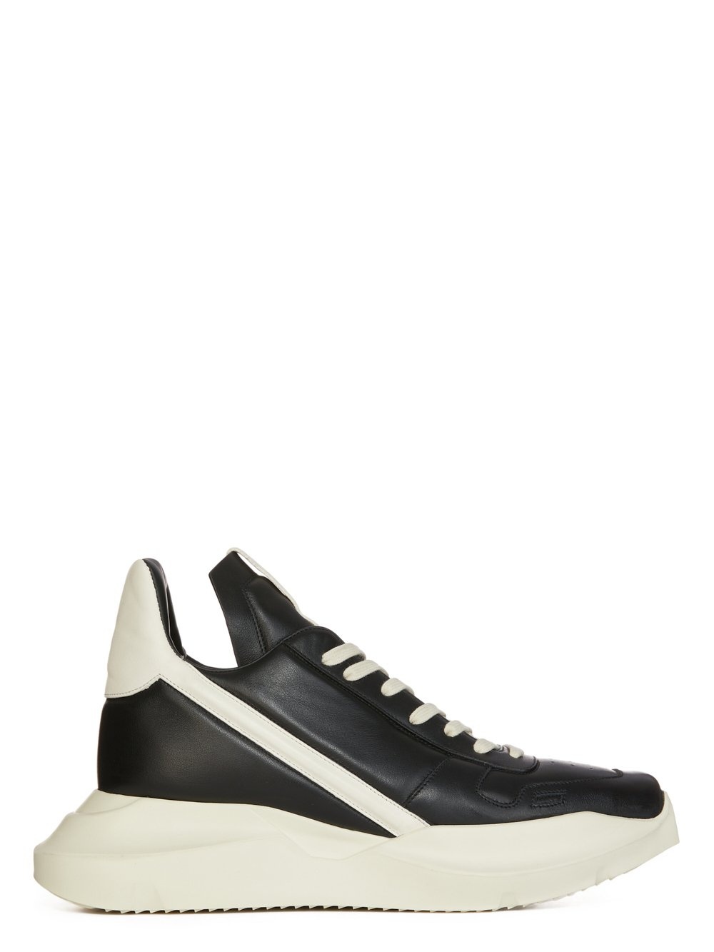 RICK OWENS SS25 HOLLYWOOD GETH RUNNER IN BLACK/MILK/BLACK/MILK FULL GRAIN CALF LEATHER THIS GETH RUNNER IS UNDER-ANKLE HEIGHT. IT HAS A CUSHIONED BACK, RISING TO A POINT, AN INTEGRATED ANGLED SIDE STRIPE, A BEVELED EXTENDED TONGUE WITH WEBBING DETAIL, AND CONTRAST LACES IT FEATURES A THICK GEOMETRIC SOLE WITH AN ANGLED, EXTENDED HEEL. THIS VERSION IS DELIVERED WITH LACES, BUT THEY ALSO HAVE AN INTERNAL STRUCTURE AND CAN BE WORN WITH OR WITHOUT THIS MEDIUMWEIGHT FULL GRAIN CALF LEATHER HAS A FLAT AND MATTE SURFACE FINISH AND IS SPECIFICALLY TANNED FOR SHOES WITH AN ABRASION-RESISTANT FINISHTHIS TANNERY IS LWG CERTIFIED WITH A BRONZE RATING COLOR: BLACK/MILK/BLACK/MILK MATERIAL: UPPER 100% COW LEATHER LINING 100% CALF LEATHER INSOLE 100% CALF LEATHER SOLE 100% E.V.A